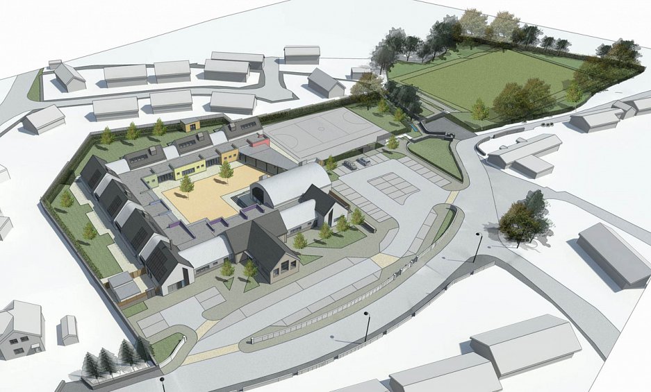 The proposal made use of the original pitched roof building located centrally on the site and and extended this to create a new open ended, sheltered courtyard development wrapping around the existing site. The new school provides six classrooms along with a number of different teaching spaces, staff and administration areas, a large hall and central resource spaces which could be used by members of the community outside school hours.