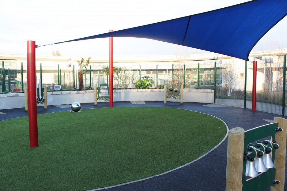 A central artificial grass oval shape provides year round use, allowing the children the opportunity to play in all weathers. A brightly coloured shade sail adds height interest to the garden space, and provides important shade for the children to play while being protected from the sun.